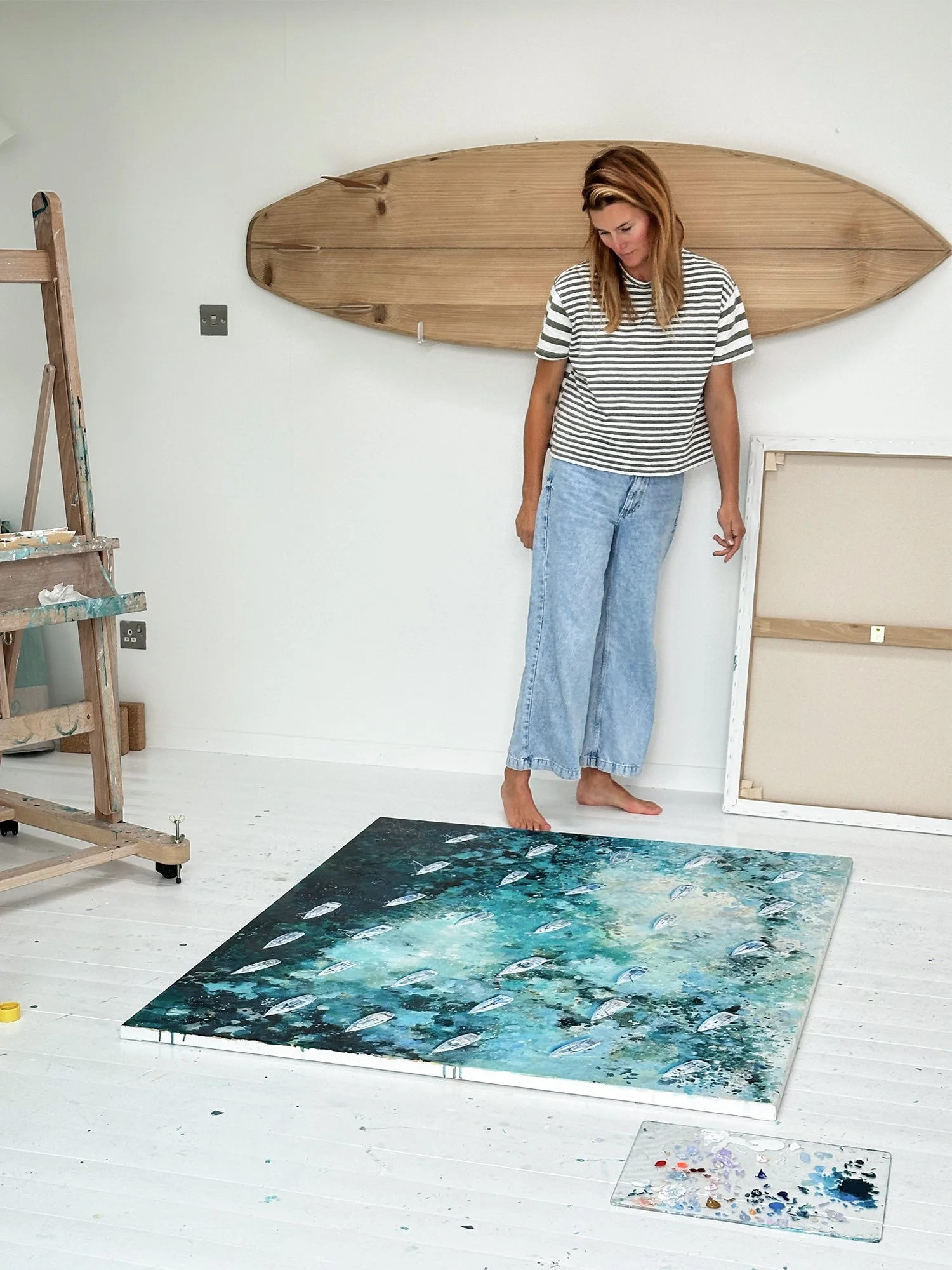 A large original aerial seascape painting on an easel in Lucy Young’s studio. The contemporary Cornish coastal artwork is shown part-finished, highlighting the professional oil painting process and Atlantic-inspired textures.